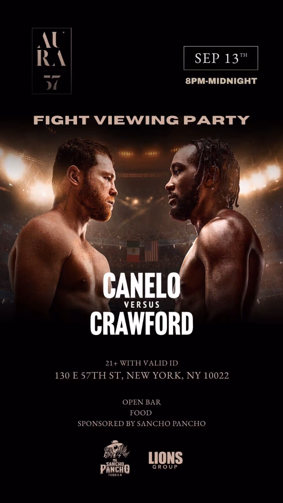 Experience one of the biggest fight nights of the year in true New York City style. Join us on Friday, September 13th from 8PM–Midnight at Aura 57 for the official Canelo vs. Crawford Viewing Party.